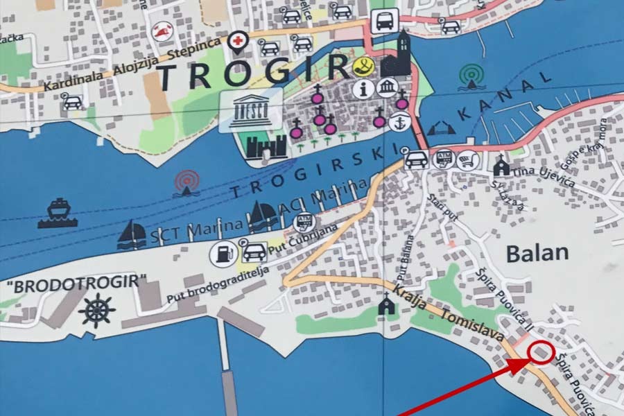 Det är enkelt att hitta från flygplatsen i Split. Kör mot Trogir, när du är framme i Trogir kör mot centrum över en liten bro, håll vänster och kör så att du har vattnet på vänster sida och staden på höger sida. Efter några hundra meter kommer nästa bro, kör över den och sväng höger, kör vidare uppför backen, först kommer en mycket skarp vänstersväng och sen går det sakta utför,. Efter några hundra meter dyker det upp en skylt med namnet QUEEN på vänster sida. Sväng uppför backen omedelbart efter denna skylt. Brant backe uppför och sväng första vänster och parkera. Parkeringen är utmärkt med nummer 7. Vi bör högst upp till vänster.